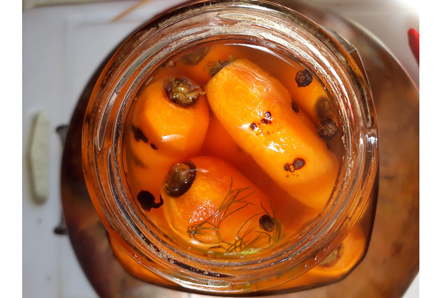 El líquido debe cubrir completamente las zanahorias y el llenado del frasco no debe superar la base del hilo o «cuello». Guardar en lugar fresco y seco.
